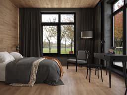 Напольное покрытие «Гевуина» имеет древесную текстуру с видимыми годичными кольцами и разводами. Цвет варьируется от светло-коричневого до темно-коричневого, создавая игру оттенков и фактур. Эффект сероватой дымки добавляет глубины и утонченности покрытию, что способствует спокойной и размеренной атмосфере в помещении. Оттенок подчеркивает свежесть и благородство натуральных древесных материалов.